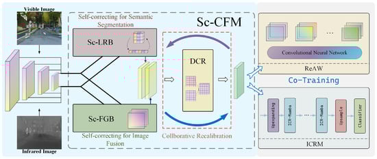 The proposed SC-CoSF is designed using a parallel strategy, consisting of image fusion and semantic segmentation subnetworks. The overall structure details are shown in Figure 2. Sc-CFM effectively extracts and couples semantic and visual information from multimodal data, while the segmentation network (ICRM) and fusion network (ReAW) extract key information from the coupled features, fully capturing detailed information and extracting semantic features.