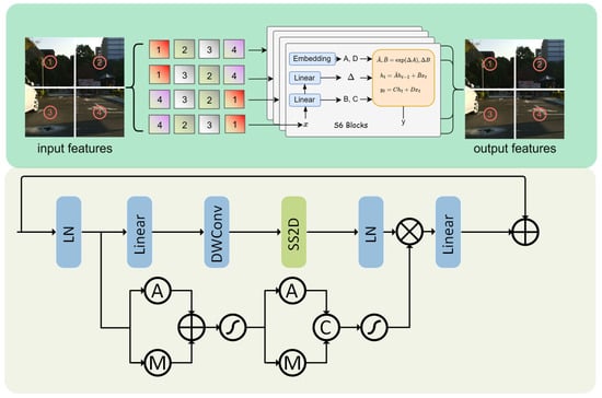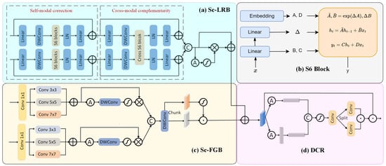 In the self-modal correction stage, the Sc-LRB first receives visible and infrared feature maps from the lower-level encoder and processes them separately through a linear layer and depthwise separable convolution for initial transformation. Subsequently, each of these two feature streams is fed into the S6 module, where linear projection layers are used to generate corresponding matrices (such as B, C, and ) for systematically capturing global dependencies. The module’s output is normalized via layer normalization (LN), passed through a linear projection to restore dimensionality, and finally, added to the original input via residual connection, thereby actively correcting intra-modal feature deviations. The formula can be represented as follows: