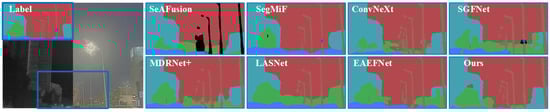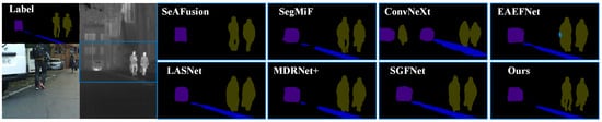 We provide comparative experiments for semantic segmentation, evaluating against seven state-of-the-art competitors: ConvNeXt [44], SeAFusion [16], SegMiF [17], SGFNet [45], LASNet [46], EAEFNet [47], and MDRNet+ [48]. The qualitative results are depicted in Figure 5 and Figure 6. The experimental results clearly demonstrate the significant advantages of our proposed method in semantic segmentation tasks. For example, as shown in Figure 5, our method preserves pedestrian contours more clearly, demonstrating a more accurate semantic decision-making capability, while the compared methods only achieve vague or approximate region segmentation. Among all the compared methods, except for SeAFusion and SegMiF, none are able to detect the background between persons. Moreover, in terms of contour segmentation accuracy, our method significantly outperforms existing approaches. Furthermore, in Figure 6, our method exhibits superior segmentation performance in terms of fine details (such as lamps). Specifically, compared with existing methods, our approach demonstrates significant advantages in the detection and segmentation of lamp objects. It consistently preserves salient features and achieves accurate detection in long-range scenarios, where other methods often suffer from missed detections or insufficient recognition. Moreover, in close-range scenes, our method captures fine contour details and achieves more precise segmentation, while the compared methods yield approximate contours with limited detail. These results clearly illustrate the superiority of our approach in multi-scale object preservation and fine-grained segmentation.