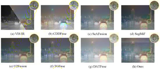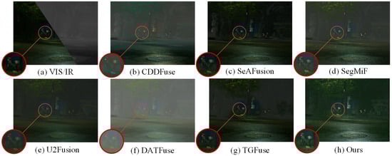 The performance of image fusion is evaluated through comparative experiments involving six advanced fusion methods, namely U2Fusion [49], SeAFusion [16], SegMiF [17], CDDFuse [10], TGFuse [50], and DATFuse [51]. The qualitative comparison results are shown in Figure 7 and Figure 8, from which we can clearly see that our method demonstrates significant advantages. In Figure 7, our approach significantly improves environmental contrast and object visibility (e.g., leaves and distant buildings) in nighttime image fusion, and it more effectively highlights the detailed features of shadowed objects. In contrast, other methods often lose their ability to perceive the environment under conditions of low visibility. In addition, Figure 8 demonstrates another advantage of our method: Guided by semantic information, our approach can significantly enhance the contrast between the detected objects and their surrounding environment, thereby effectively improving the texture details in the scene and presenting a clearer and more realistic visual effect. In contrast, other methods fail to highlight the boundaries and details of objects as prominently when processing similar scenes, which affects the overall image quality and visualization.