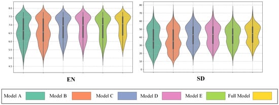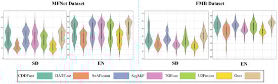 Due to the lack of ground-truth data, we adopted no-reference metrics EN [52] and SD [53] to evaluate the amount of information and contrast. As shown in Figure 9, SC-CoSF achieved the highest scores on most metrics. In addition, the widest section of the violin plot is concentrated in the upper-middle part of the curve, further confirming that our method consistently achieves superior fusion performance across the majority of images. The above results demonstrate the advanced performance of our method in image fusion.