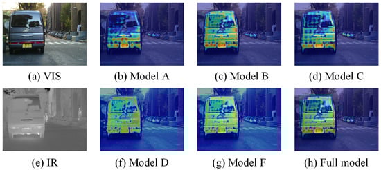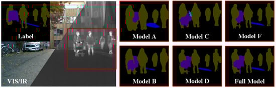 We conducted extensive ablation experiments on the MFNet dataset to verify the effectiveness of our proposed correction module. In addition, we designed corresponding ablation experiments for different task heads to validate the effectiveness of joint learning. Specifically, our model includes the following variants: Model A: Replacing Sc-CFM with tensor addition; Model B: Removing Sc-FGB; Model C: Removing Sc-LRB; Model D: Replacing DCR with tensor addition; Model E: Removing the semantic segmentation head; Model F: Removing the image fusion head. It is worth noting that for variants E and F, we only conducted the corresponding ablation experiments for the tasks they are associated with. The qualitative and quantitative results of semantic segmentation are shown in Table 4 and Figure 10. It can be seen that removing any module affects the model’s performance. Notably, the results of variants A and C show a significant decrease in contour accuracy for objects (such as pedestrians), highlighting the importance of Sc-LRB in the semantic segmentation task, as it provides strong global contextual capabilities. Additionally, we introduce attention heatmap visualizations in Figure 11 to intuitively compare how each module influences the segmentation process. The results clearly illustrate that the attention heatmaps of models A and C fail to encompass the complete outline of the vehicle, further underscoring the superior performance of Sc-LRB in semantic segmentation tasks.
