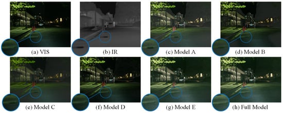 Figure 12 and Figure 13 present the performance of different variants in image fusion, showing that each module plays a crucial role in the final results. For example, replacing either Sc-LRB or Sc-FGB would make it difficult for the model to recognize and handle the shadows at crossings. These results demonstrate the positive impact of our design on both semantic segmentation and image fusion.