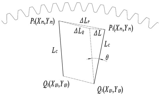 - Compute the four-parameter values , , , and using the coordinates of points and derived from Steps (2) and (3) in both the image physical coordinate system and the 2D dot array calibration plate coordinate system. During rotational angle measurement, as the large gear undergoes rotary motion, the image physical coordinate system experiences relative rotation with respect to the 2D dot array calibration plate coordinate system. Consequently, the four parameters describing the coordinate transformation for each image vary with each rotation angle.