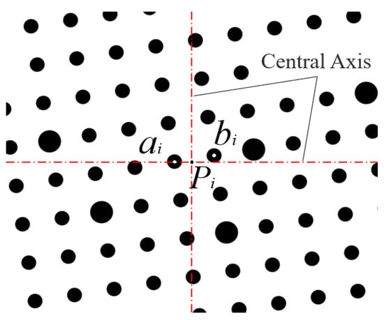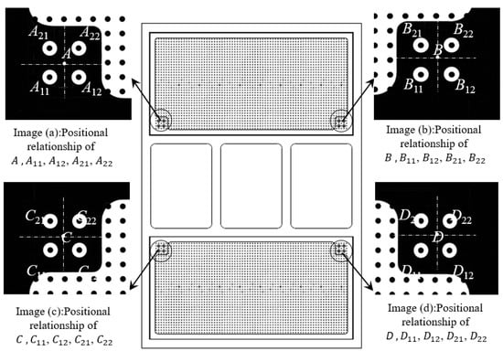 - From image , extract the coordinates of the calibration circle center closest to the field of view center and its right adjacent circle center in the image pixel coordinate system: and . Additionally, derive the camera center coordinate in the same coordinate system. Chose as the reference point because the area near the center of the field of view is less affected by camera distortion. Select primarily for programming convenience and ease of identification. The positional relationship of these three points is illustrated in Figure 7.