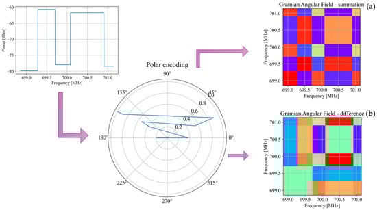 Writing the summation or difference of different angles in Equation (3) as inner products, allows us to clearly observe the correlation of two vectors. In this way, the GASF and GADF matrices reflect the correlation between the angle sum and angle difference, respectively. The GAF is a matrix representation that encodes a discrete set of points in a square image. This image captures the relationships and dependencies between the points in the set, making it easier to analyze them considering image processing methods. Figure 1 shows the result of applying the GAF in its different modes (sum and difference) to a discrete signal representing power averages in several frequency intervals (bands).