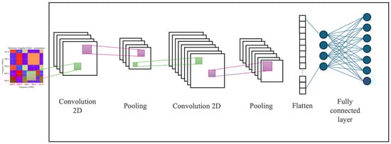 A typical CNN consists of several layers (see Figure 2): the convolutional layer, which extracts local features from the image using filters; and the pooling layer, which reduces the spatial dimensions of the feature map, preserving essential information. After several convolutional and pooling layers, the features are flattened into a dense vector, which is passed to the fully connected layers to perform classification. Finally, the network adjusts the weights using backpropagation and optimization algorithms, such as Stochastic Gradient Descent (SGD), to improve the accuracy of estimates []. The activation function (such as ReLU, sigmoid, or tanh), applied in every layer, introduces nonlinearity and improves learning by avoiding the vanishing gradient problem.