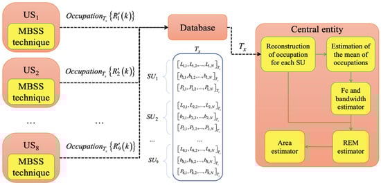 The complete CRN integrates three main components (see Figure 4): first, a central entity, collecting all the locally processed sensed data (i.e., spectrum occupancy, frequency band edges, and estimated power vectors) from each SU. Second, a database, systematically storing the received information at specific time intervals for further analysis. Finally, data processing, realized by the central entity, employing advanced computational techniques to analyze spectrum utilization (occupation) and optimize resource allocation, in order to determine the geographic regions occupied by PUs in the radio spectrum through the construction of radio environment maps (REMs).