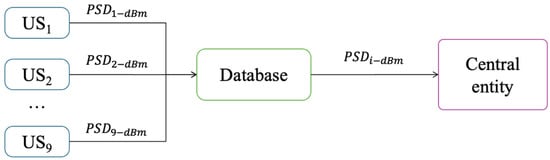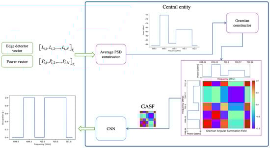 In this proposal, the previous methodology (Section 3) is modified, integrating the GAF method and a CNN to enhance the system’s performance in detecting PUs. This new proposal considers first that each SU shares only the average PSD, resulting from the estimated PSD from each analyzed dynamically sized window, with the central entity obtained through the database, as shown in Figure 5.