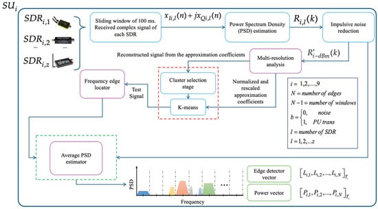 In Figure 3 it is shown how each secondary entity (SU), equipped with heterogeneous technologies (SDRs), performs multiband spectrum sensing (MBSS), obtaining three fundamental vectors: (i) the edge detector vector , which stores the edge frequencies at which the presence of PUs can be identified over (N − 1) dynamically detected windows; (ii) the binary decision vector , which contains the binary decisions corresponding to delimited bands, which indicate the detection of noise or the possible transmission of PUs; and (iii) the power vector , which records the average received power for each classified window, i.e., for each binary decision. Thus, the binary and power decision vectors are of an equivalent size. In addition to the task of monitoring the radio spectrum and analyzing the behavior of PUs in a specific geographic region, this cooperative CR network aims to mitigate the hidden terminal problem, thus ensuring a more efficient and reliable use of the spectrum.