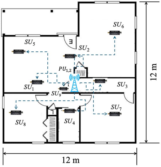 It should be noted that this environment was previously used and characterized in [], which presents a realistic wireless communication scenario. This proposed environment incorporates the presence of walls, doors, windows, and columns, which affect signal propagation, thus allowing for a more accurate and representative assessment of spectral behavior in real-world operating contexts. The spatial distribution of these elements can be seen in Figure 8, while Table 1 details the technical parameters used for configuring both the SUs and PUs.