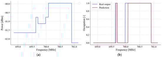 During the training stage of the neural network, the inputs are represented by the average power values, as mentioned above. For each input provided, the network generates a set of 732 binary outputs, where each bit corresponds to a specific point in the frequency domain (Figure 9). A value of ‘1’ at the output indicates the presence of a possible transmission, while a value of ‘0’ suggests the absence of a signal, being interpreted as noise. This approach allows the spectral occupancy to be accurately characterized, facilitating the identification of active regions within the analyzed frequency spectrum. For model training and validation, a total of 22,500 frames were used. This dataset was internally divided into two separate subsets: approximately 80% of the data (18,000 frames) was allocated for training the model, while the remaining 20% (4500 frames) was reserved for validation during the tuning phase. This careful split ensured that hyperparameter adjustments and model selection were performed using data not directly seen during training, thereby helping to prevent overfitting. Additionally, to provide an unbiased evaluation of the model’s generalization capacity, an entirely independent test set of 4500 frames was used. These test frames were not included at any point in the training or validation processes, guaranteeing a fair and realistic assessment of the model’s performance on unseen data.