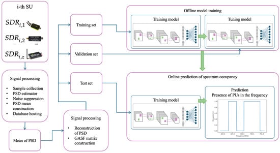 The complete training process is illustrated in Figure 10. This processing involves real-time data acquisition within a real wireless communication environment that includes two PUs, as was explained in the preceding section.