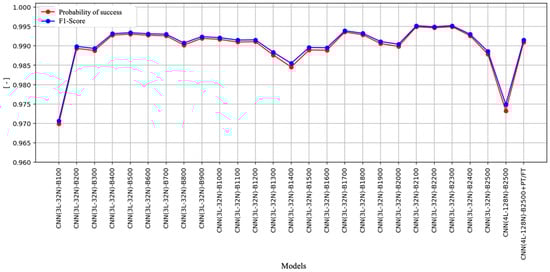 Figure 11 presents the results of the evaluation of various CNN architectures using these metrics. In this figure, we can observe that all architectures achieve a probability of success close to 1.0 (or 100%), which indicates that the models have an accurate and stable performance when classifying the samples. This behavior suggests that, regardless of the variations in the CNN configuration, the system achieves high accuracy in identifying the expected outputs. The graph on the right shows the F1 score obtained by each model, which also reaches values close to 1.0 in all configurations. Since the F1 score is a metric that combines precision (proportion of correct predictions) and exhaustiveness (ability to detect positive cases), these results suggest that the networks not only get their predictions right but also have a low incidence of errors by minimizing false positives and false negatives.