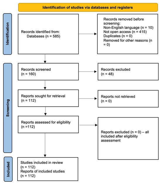 The study selection process followed a structured multi-stage approach. An initial search across major scientific databases including Scopus, Web of Science, IEEE Xplore, SpringerLink, and Google Scholar yielded 585 records. After excluding 10 non-English language publications, an open-access filter was applied, reducing the dataset to 160 publications. Subsequently, only peer-reviewed journal articles and conference papers were retained, which led to the exclusion of 48 non-research or gray literature documents. The final dataset consisted of 112 publications, which were used for qualitative and thematic analysis in this systematic review. A detailed breakdown of the screening process is presented in Table 1 and visualized using a PRISMA flow diagram (Figure 1).