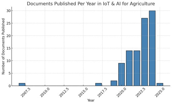 The results clearly indicate that before 2019, research in this domain was limited, with only isolated studies exploring IoT-based applications in agriculture. However, from 2020 onwards, there was a rapid increase in publications, reflecting the growing interest in AI-driven smart farming solutions. The sharp rise in 2023 and 2024 suggests a growing acceptance of these technologies, driven by advancements in low-power IoT devices, cloud computing, and AI-based analytics.