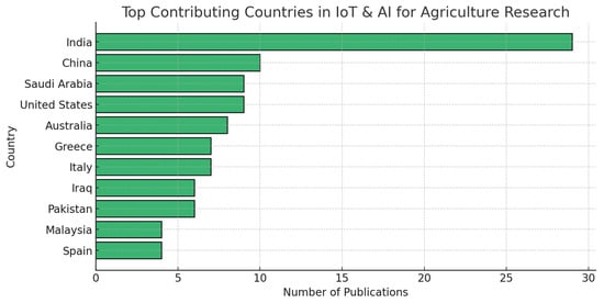 The global distribution of research contributions highlights significant regional disparities in IoT and AI adoption in agriculture. A review of publication data by country or territory reveals that India leads in research output, followed by China, Saudi Arabia, and the United States (Figure 3).