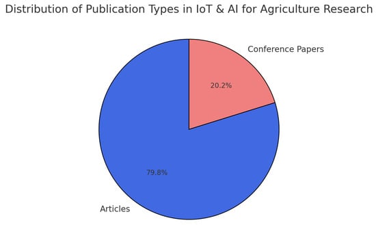 An analysis of the publication trends in IoT and AI applications in agriculture indicates a dramatic increase in research activity over the past five years. The distribution of peer-reviewed articles and conference papers by year reveals that the field has gained substantial momentum, particularly in the years 2022–2024 (Figure 2).