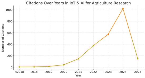 An examination of citation trends reveals that research in this domain has experienced progressive growth in academic impact. Early studies (before 2015) received minimal citations as the field had yet to gain prominence. However, from 2020 onwards, citation numbers increased exponentially, reflecting the growing recognition and integration of AI and the IoT in agricultural research (Figure 5).