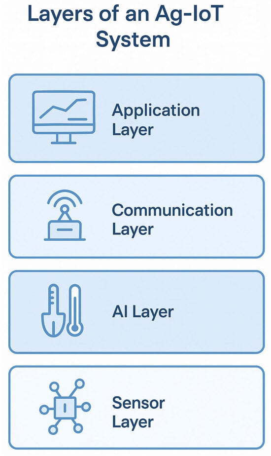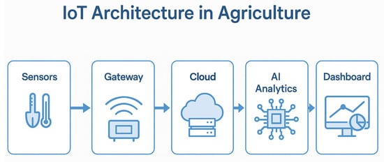 The IoT, in the context of agriculture, refers to networks of interconnected sensors, actuators, and cloud-based platforms that enable the real-time monitoring and automation of critical agricultural processes [,]. These systems collect large-scale, high-resolution data on soil properties, climate conditions, crop growth, and pest infestations, facilitating data-driven decision-making [,,]. AI further enhances these capabilities by employing machine learning (ML) and deep learning (DL) algorithms to analyze sensor data, predict future outcomes, and automate responses, reducing reliance on human intervention [,]. The synergy of IoT and AI-driven solutions enables precision agriculture, allowing farmers to apply water, fertilizers, and pesticides with optimal efficiency, thus reducing costs and minimizing environmental impact [,,,].
