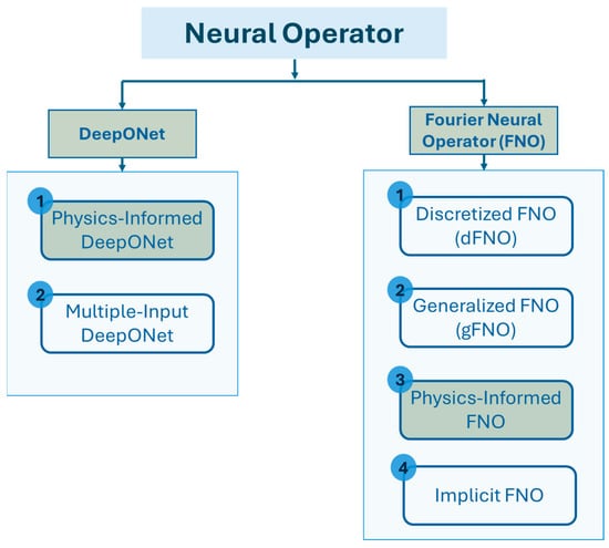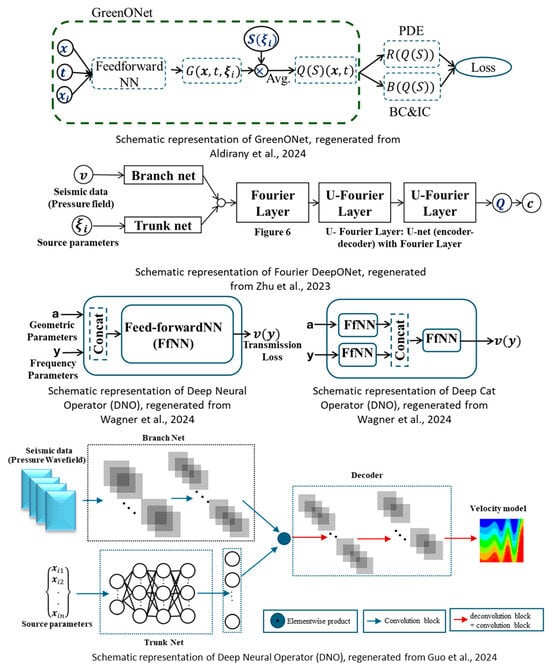 Variants of DeepONet and FNO architectures [85]; models highlighted in green have been utilized for wave equation modeling.