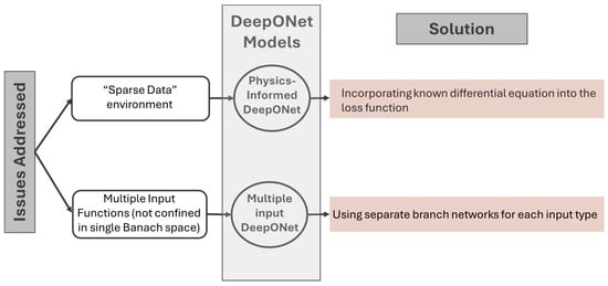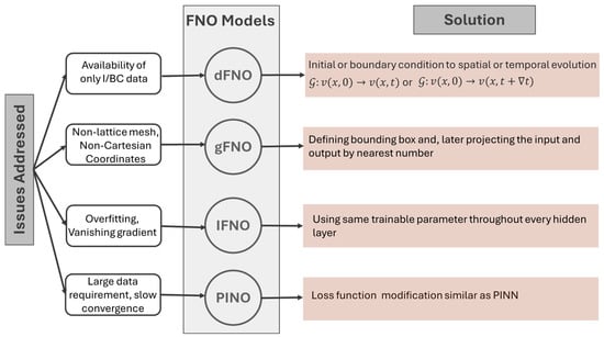 Based on this concept, until now, scholars in this field have proposed various neural operator architectures, namely deep operator network (DeepONet) [79], Fourier neural operator (FNO) [80], wavelet neural operator (WNO) [81], Laplace neural operator (LNO) [82], convolutional neural operator (CNO) [83], spectral neural operator (SNO) [84], and many more. To date, only DeepONet and FNO, along with some of their variants, have been applied to wave PDEs. Figure 2, based on Goswami et al. [85], illustrates some of the major DeepONet and FNO variants, highlighting those used in wave propagation studies. Figure 3 and Figure 4 summarize the key challenges addressed by each variant and outline the corresponding solution strategies within the two neural operator frameworks.