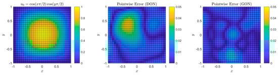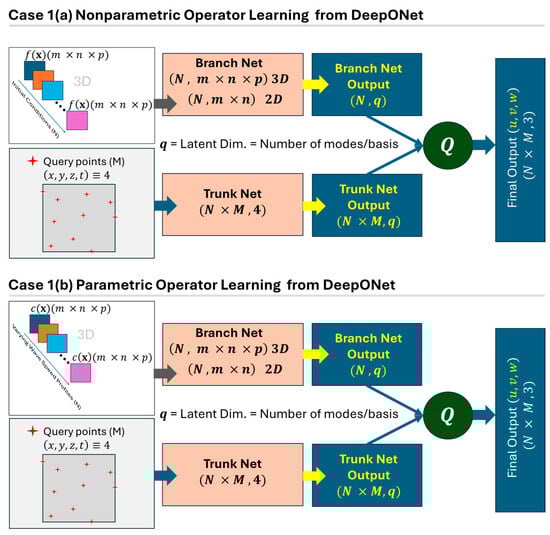 Now, with the above concepts, generally speaking, DeepONet does not explicitly construct the kernel function in Equation (6) but represents the operator via latent basis functions and coefficients. Comparing Equations (6) and (9), it can be said that DeepONet replaces the continuous effect of the kernel integral with a weighted combination of learned basis functions, where the weights depend on the input function, and the basis functions capture how each point in the domain responds. Figure 6 shows two different cases with parametric and nonparametric PDEs modeled using DeepONet for wave propagation.