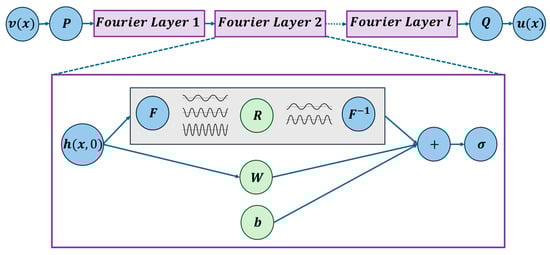 Based on this explanation, now it is easier to understand Equation (10), where there are multiple FNO layers present, designated with index . Every FNO has its own inputs and respective outputs in a sequence. , the pointwise linear operator, , the bias and activation function in Equation (10) are now self-explanatory from the fundamentals of neural networks.