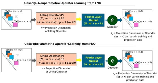 A schematic architecture of two cases for nonparametric and parametric PDE modeling using FNO.