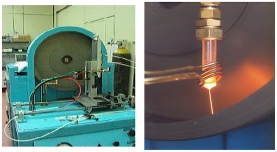 On the other hand, the microwire (indicated as “MW” hereafter) was fabricated in the laboratories of ICMM/CSIC having an Fe75Si10B15 alloy composition, and a high positive-saturation magnetostriction of 32 ppm. This microwire shows, like the ribbon, a soft magnetic character, and the main difference is its cylindrical shape. The microwire is expected to result in a lower sensor response than the ribbon owing to its smaller cross-section. However, it can be used both as a fiber reinforcement and sensing material, a combination which makes it a smart material. The microwire with the around 100 micrometer diameter was fabricated by the in-rotating-water technique, where the desired precursor polycrystalline alloy was molten inside a quartz tube because of high-frequency induction at 1250 °C, as shown in Figure 1. The end of the quartz tube had a small hole through which the molten alloy was ejected under the action of argon overpressure and plunged into cold rotating water. The high cooling rate to room temperature was achieved in a few milliseconds, which resulted in an amorphous alloy with a cylindrical shape. Note that, in the case of the amorphous ribbon, the process was similar, where the alloy was quenched by its ejection onto the surface of a CuBe rotating wheel.