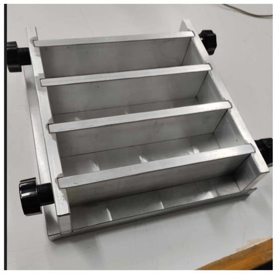 Standard concrete beams were used in this study, which were fabricated in our laboratory from the following raw materials: (a) a Durostick, commercial, gray, Portland cement-type PlusCem 52.5N, which is a commercial fiber-reinforced hydraulic binder, (b) mechanical oil, (c) petrolatum, (d) distilled water, and (e) standard sand with SiO2 aggregates > 99%. The percentage by weight of water/cement/sand was equal to 1:2:6. The concrete samples were manufactured according to the EN 196-1 standard [28], using a simple mixer and the aluminum molds shown in Figure 2 with internal dimensions of 4 × 4 × 16 cm3. The molds were oiled for easy demolding and the joints were sealed with petroleum jelly. After pouring the mix into the molds, it was solidified by placing the molds in a refrigerator for one day. Following this, the samples were demolded and immersed in distilled water for 27 days to harden.