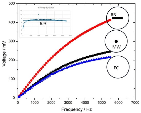 Plots of sensor signals received from the setup of Figure 3, Empty coil (EC blue), Microwire (MW black) and Ribbon (RB red). The circles represent the detection coil cross section with the sensor inside it. The inset shows the ratio of the two sensor signals after the empty coil signal is subtracted.