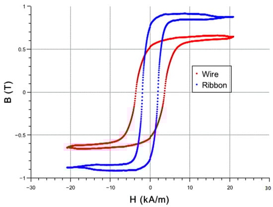 Shown in Figure 6 are the magnetic hysteresis loops for the two sensors, both with a length of 6 cm. Unfortunately, the two loops were received via different techniques and are plotted on the same graph only for the sake of comparison. The ribbon data were collected by an AC susceptibility technique at a frequency of 1000 Hz. The ribbon loop looks like it reached its saturation, which is T according to the literature. On the contrary, the microwire loop still has a small slope, and higher fields are required to bring it to saturation, which is typically close to T for this synthesis.