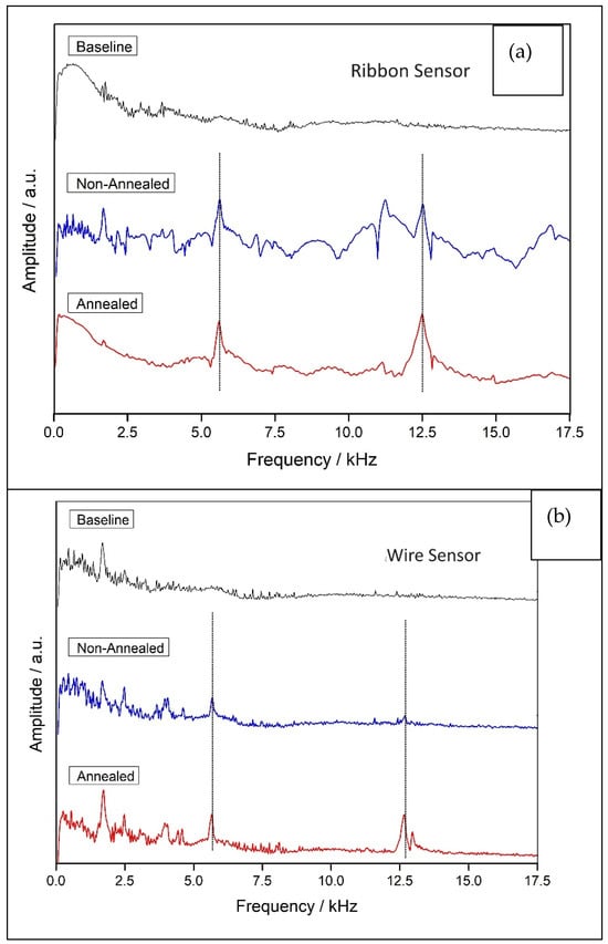Comparison of annealed versus non-annealed sensor signal (a) for the ribbon and (b) for the microwire.
