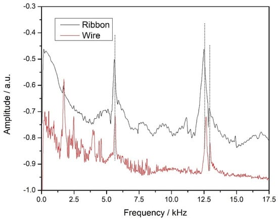 Table 2 shows the percentage changes in peak heights and frequencies with and without annealing for the two sensors. From this table, it is evident that the annealing process had literally no effect on the mode frequencies of the beams (changes less than 1%), which was expected and which proves that these frequencies are characteristic of the beams and not some sensor property (the same beam was used before and after the annealing process so as to have the same comparison standards). Concerning the amplitude of the peaks, there was a significant signal gain in the range from 10 to 30%, with the signal gain for the first peak being greater for both sensors (RB and MW). Finally, the gain was greater for the RB sensor than the MW sensor for both peaks. Perhaps this is due to the greater symmetry of the cylindrical shape of the wire sensor compared to the rectangular shape of the ribbon, which results in less local remaining stresses during the rapid-cooling production process.