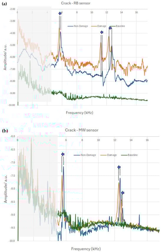 Comparison of the FFT spectra of the two sensors, (a) RB and (b) MW, when a crack is introduced in the same concrete beam (per sensor) in the setup of Figure 7.