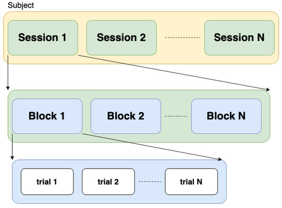 fNIRS data introduces additional challenges for autonomous processing tasks, including CWL classification. More specifically, the high variations in inter-subject fNIRS data (when subjects perform the same task) as well as in intra-subject data captured during different sessions need to be addressed. Block-wise experiments are a common method for collecting fNIRS data [4,16]. In this type of experiment, a participant performs a series of trials, which constitute a block, and a series of blocks constitutes a session. In each trial, participants are required to perform one specific task. Figure 1 illustrates the structure of block-wise experiments for one participant, where Session 1, Session 2, …, Session N denote different sessions.