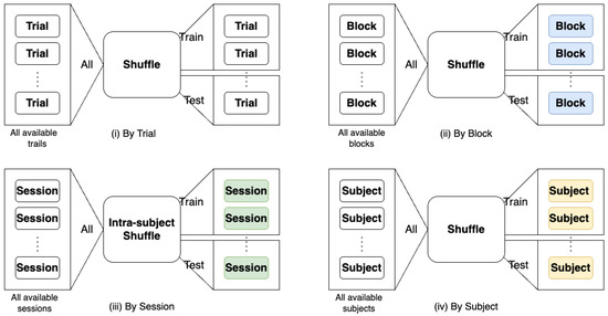 Four different split scenarios: Split by (i) trial, (ii) block, (iii) session, and (iv) subject.