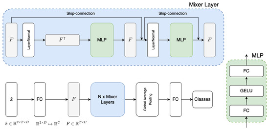where is an element-wise non-linearity GELU [46] layer and and are the weights and bias, respectively, for the first FC layer. They map the input feature to a hidden feature. More specifically, with temporal-mixing and with channel-mixing, where and are the hidden dimensions for temporal-mixing and channel-mixing, respectively. Similarly, and are the weights and bias, respectively, for the second FC layer mapping the hidden feature to the same dimension as the input feature. More specifically, with temporal-mixing and with channel-mixing. The output feature of an MLP block has the same dimension as the input feature to fit the residual skip-connection, which is a commonly used deep-learning approach proposed in ResNet [47].