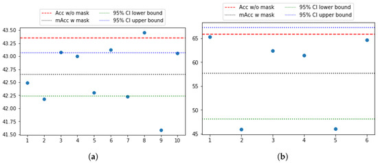 Accuracy plot when using one mask (discarding four channels) at a time with (a) MLPBiGRU-Block-DA on TUBerlin and (b) MLPMixer-Block-DA on FFT. The x-axis shows the mask number and the y-axis shows the k-fold cross validation accuracy on test splits. The black dotted line represents the average performance across all remaining channel positions. The red dash line shows the performance with no masking. The green and blue dot-dash lines indicate the lower and upper bounds of the 95% confidence intervals of the masked accuracy.