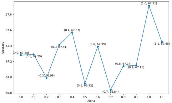 We also trained our model using BWise-DA and with different values of . As seen in Equation (8), weights the and terms in the objective function. We conduct our experiments on the Tufts dataset, since it has the largest amount of participants and the original paper [16] has released 17-fold splitting. We report the grid search of starting from 0.0 to 1.1 with step size of 0.1. The mean accuracy of our MLPMixer is reported in Figure 6, which shows how the mean accuracy of MLPMixer varies with different values of .