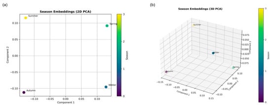 Because both temperature and humidity are related to the climatic seasons, the seasons were coded as an integer (0−3) and incorporated using the four-dimensional embedding layer. The coding process groups the months into four seasons according to meteorological convention: December–February (0), March–May (1), June–August (2), September–November (3). This layer initializes its vectors randomly and, during training, adjusts these vectors by backpropagation of the error—along with the rest of the network weights—to minimize the loss function. In this way, the model automatically learns to locate stations with similar weather patterns close to each other in the vector space, improving the LSTM’s ability to capture temporal and seasonal relationships. The optimal number of dimensions was determined by modifying the parameters of the embedding layer and evaluating the model’s overall performance.