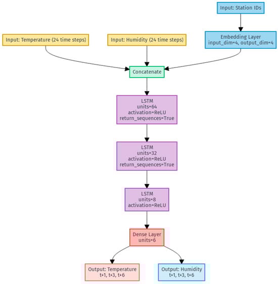 The architecture is structured as an LSTM network organized into three levels. The initial layer has 64 units and uses the return_sequences function to collect temporal data for the entire sequence. The second layer has 32 units and also uses the return_sequences function, and the third LSTM layer is composed of 8 units. All of the layers use the ReLU activation function, which provides nonlinearity in the variables. The output layer is a dense layer with 6 units and a linear activation, for the 3 temperature and 3 humidity predictions, corresponding to the time windows t+1h, t+3h, and t+6h. Thus, the input to the model is 24 samples of both temperature and humidity, concatenated to the 4-dimensional embedding layer learned during training.