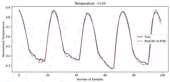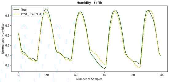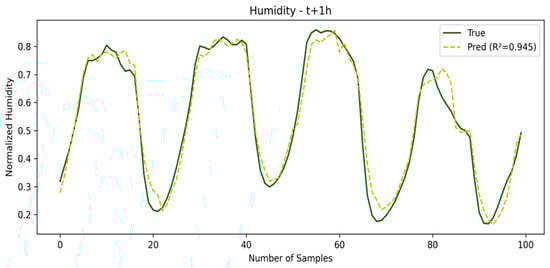 The SE-LSTM model also performs well, with competitive metrics and an for temperature of 0.9781, demonstrating that the use of embeddings based on meteorological representations helps capture short-term patterns. The SE-LSTM predictions for temperature and humidity are illustrated in Figure 3 and Figure 4, respectively, while the performance metrics are summarized in Table 1.