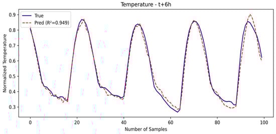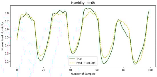 In this window, the errors tend to increase for all of the models. SE-LSTM remains consistent, while the other models show greater performance degradation. This demonstrates that the use of embedding in SE-LSTM helps maintain stability in medium-term predictions, particularly for the temperature variable. The SE-LSTM predictions for temperature and humidity are illustrated in Figure 5 and Figure 6, respectively, while the performance metrics are summarized in Table 2.