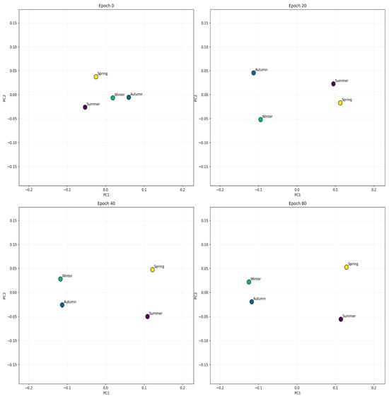 The arrangement of points on a semicircle illustrates how the embedding vectors captured seasonal variations in the climate variables. Using a PCA dimensionality reduction, these four-dimensional vectors allow for the connections between seasons. Contrary seasons, such as summer and winter, are often reflected in opposite areas of the plane, as the embeddings have learned to represent their different weather patterns (such as high temperatures and low humidity under opposite circumstances). Spring and autumn, during periods of greater climatic stability, emerge in the transitional areas. This illustration shows how the model was able to gather seasons with similar climatic behaviors close to each other in the vector space.