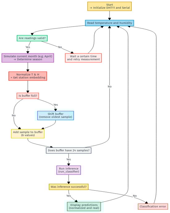 As seen in the flowchart in Figure 11, setting a default month, we take every hour as an update, with a circular memory buffer; the number of buffers can be increased to measure it in real time for every minute or every 10, 15, or 20 min, where each buffer (independent of the other buffers) is an entry to the network, but the SRAM memory must be taken into consideration. Generally, each buffer occupies 576 bytes (144 values of 4 bytes, float type variables), so with six active buffers, the total consumption of only the buffers in RAM would be 3456 bytes. Once the buffer is filled or every time it is updated with a new value, it will have one output per buffer so that only at the beginning will the system require a 24-h calibration to begin predicting correctly.