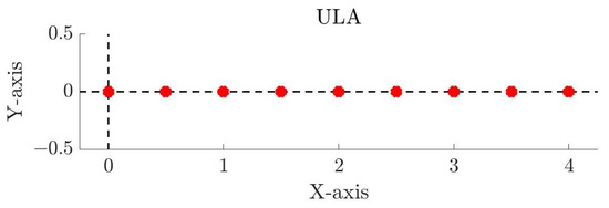 Starting with the linear arrays, the ULA is designed so adjacent elements have half-wavelength interelement spacing. Since there are nine antenna elements, the total aperture is equal to . The first antenna element is placed on the coordinate origin and the remaining elements are placed on the positive x axis. The element distribution of this array is shown in Figure 1. For the NULA, the first and last antenna element are the same as the ULA, which keeps the aperture fixed. The remaining seven elements are repositioned so that the array has a non-uniform spacing. The positions of the antenna elements for both the ULA and the NULA are given in the first two columns of Table 1.