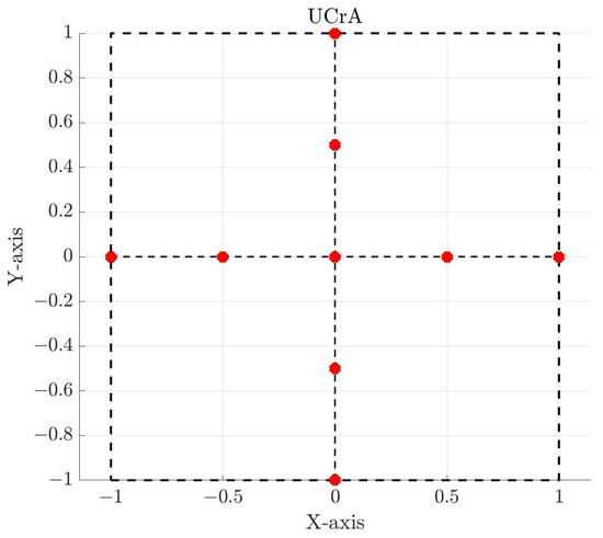 The Uniform Cross Array (UCrA) has an antenna element at the coordinate origin, and the remaining elements on the x and y axes with half-wavelength spacing between adjacent elements. Thus, the total aperture of the array is a square with side length . The element distribution of this geometry is shown in Figure 2. The Non-Uniform Cross Array (NUCrA) has non-uniform spacing. The center and edge antenna elements are still fixed to their positions, but the internal elements are moved. Table 1 lists the positions of the elements for these arrays, in the columns marked UCrA and NUCrA.
