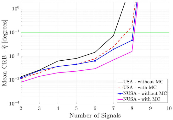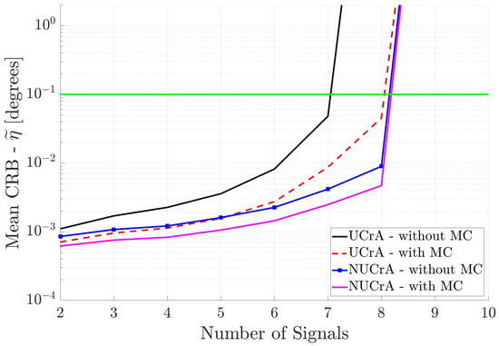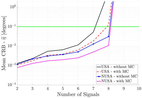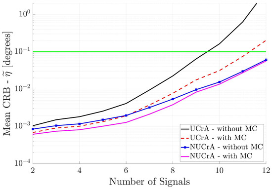 Next, we reproduce the mean CRB results and include the uncorrelated signal information in the CRB analysis. This seemingly minor change has a significant impact on the mean CRB. Now, the number of unknowns is reduced to because the off-diagonal values of are known to be zero. This reduces the size of the FIM in the CRB calculations, and as will be shown, significantly impacts the DOA estimation performance of the antenna arrays studied.